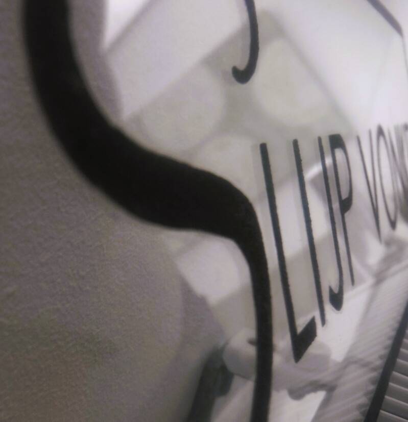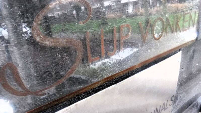Inderdaad de tekst is geroest. Dit is een heel mooi en stoer contrast op het glas.